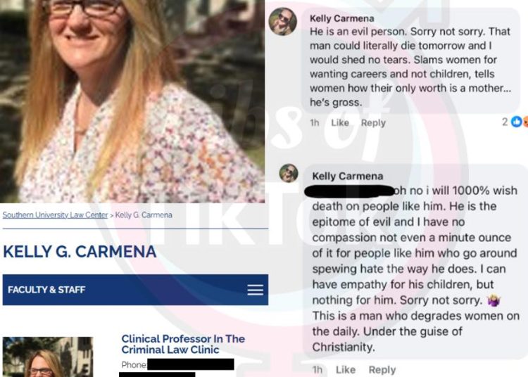 In Kelly Carmena’s post obtained by WAFB-TV in Baton Rouge, she wrote, “I will 1000% wish death on people like him. He is the epitome of evil, and I have no compassion, not even a minute ounce of it for people like him who go around spewing hate the way he does.”