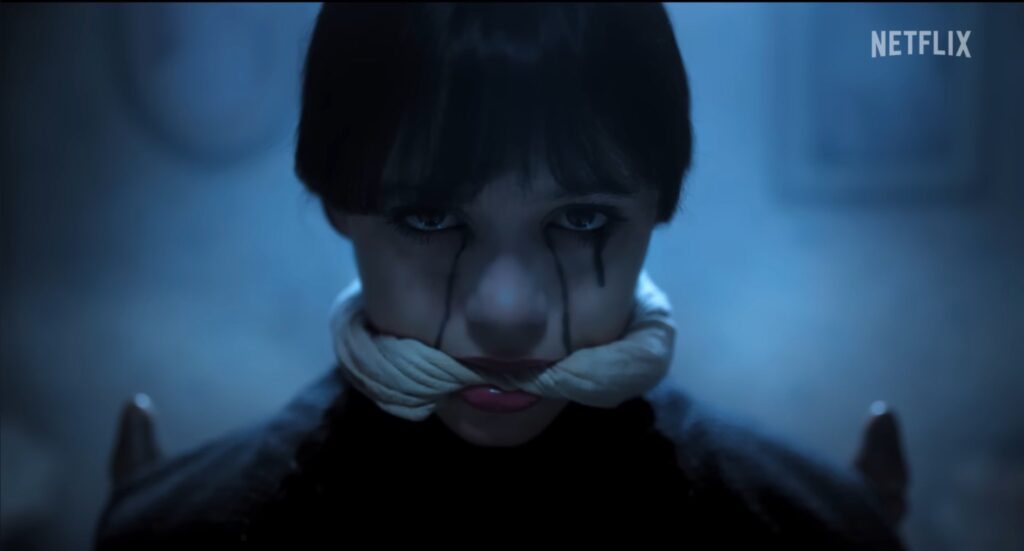 In a dark new twist of fate, Wednesday experiences a haunting premonition: Enid Sinclair (Emma Myers), her bubbly werewolf BFF, is dead… and it’s all Wednesday’s fault. The moment is characterized by black tears flowing down her face, tears that would otherwise kill if they weren’t foretelling the death of someone.
